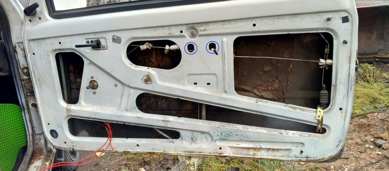 Устанавливаем электростеклоподъёмник крепим при помощи 2 гаек с шайбами от штатного, подключаем проводку и поднимаем механизм в верхнее положение и фиксируем стекло через отверстия обозначенными синим на рисунке выше двумя болтами, которые откручивали ранее.
